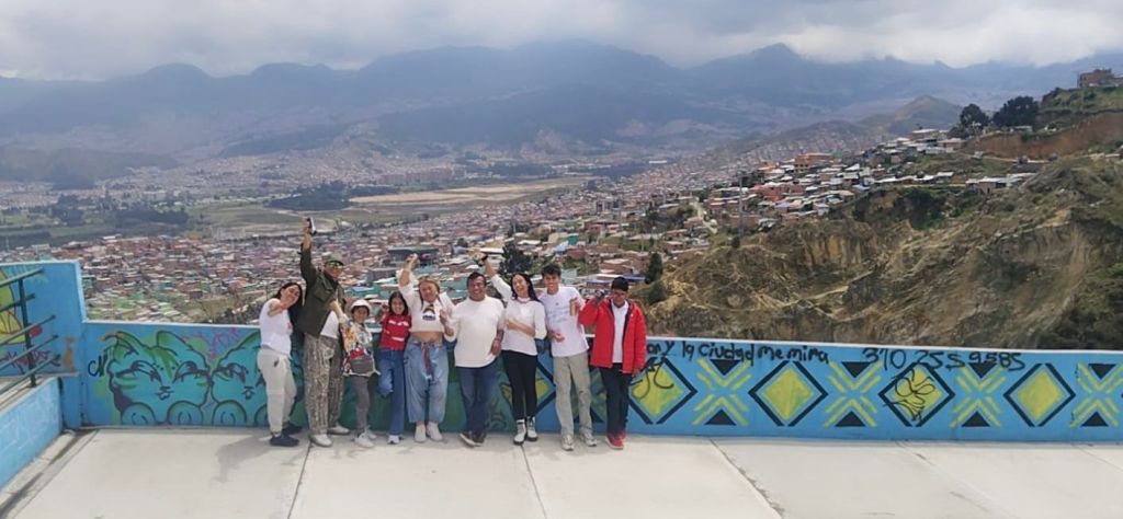 Luego visitamos otro sitio icónico del sector: el Parque Mirador Illimani, un espacio con juegos para niños donde nos quedamos un buen rato charlando y disfrutando la vista. Más colores, más murales y más historias, para después quedar listos para el almuerzo.